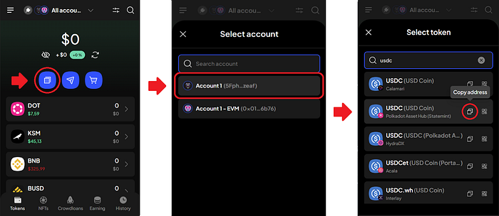 Open your wallet browser extension, usually located in the top-right corner of your browser window; click on your Polkadot account; search for USDC and make sure to copy the correct wallet address for USDC on Polkadot’s Asset Hub. The screenshots below show this process using the SubWallet, but the process is similar for most other Polkadot wallets such as Talisman.